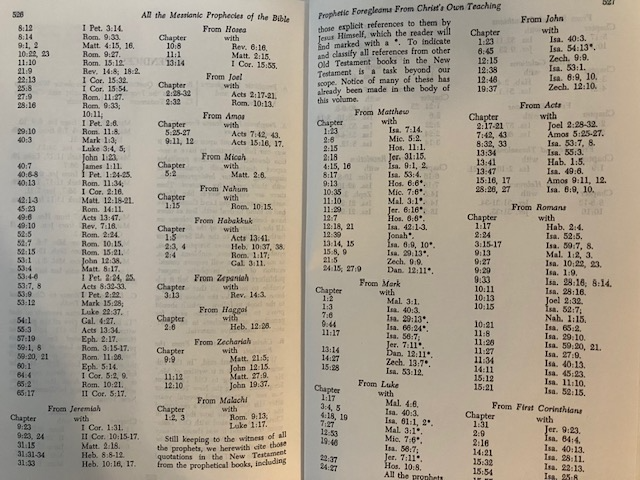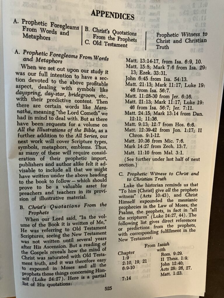 07/13/2025 – “All the Messianic Prophecies of the Bible” by Herbert Lockyer (ISBN # 0-310-28091-5) / Attached Appendices, pgs 525 – 528: A) Prophetic Foregleams from Word and Metaphors; B) Christ’s Quotations from the Prophets; and, C). Old Testament Prophetic Witness to Christ and Christian Truth.